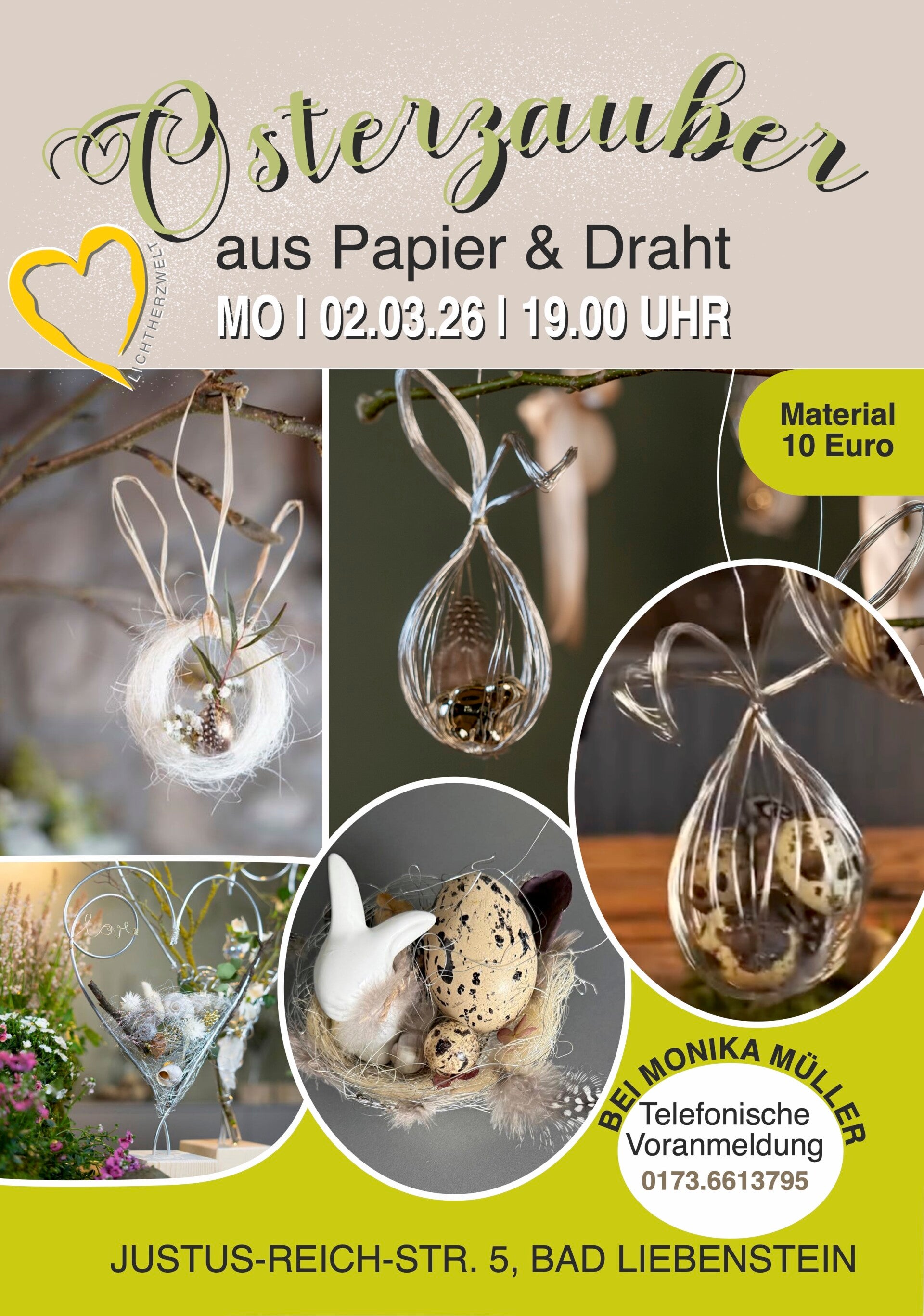 Ich möchte dich zu einem privaten, gemütlichen Kreativabend einladen, an dem wir moderne Osterdekos aus Papier und Draht gestalten.